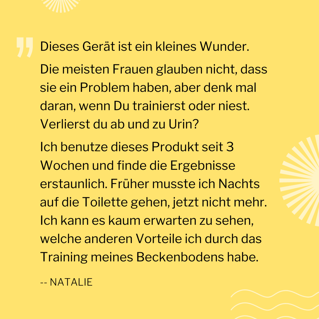 " Dieses Gerät ist ein kleines Wunder. Die meisten Frauen glauben nicht, dass sie ein Problem haben, aber denk mal daran, wenn Du trainierst oder niest. Verlierst du ab und zu Urin? Ich benutze dieses Produkt seit 3 Wochen und finde die Ergebnisse erstaunlich. Früher musste ich Nachts auf die Toilette gehen, jetzt nicht mehr. Ich kann es kaum erwarten zu sehen, welche anderen Vorteile ich durch das Training meines Beckenbodens habe. "